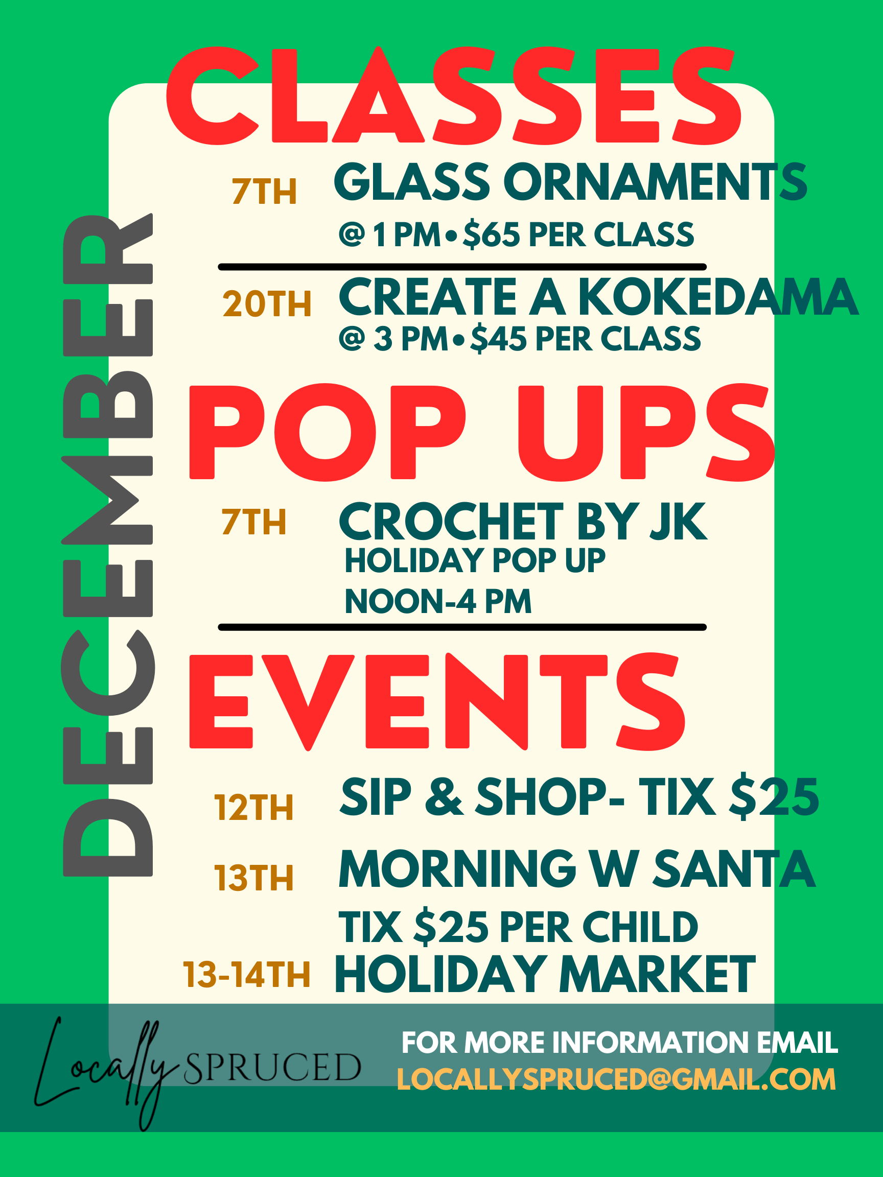There’s a lot going on at Locally Spruced this month! Check the details in the image below.